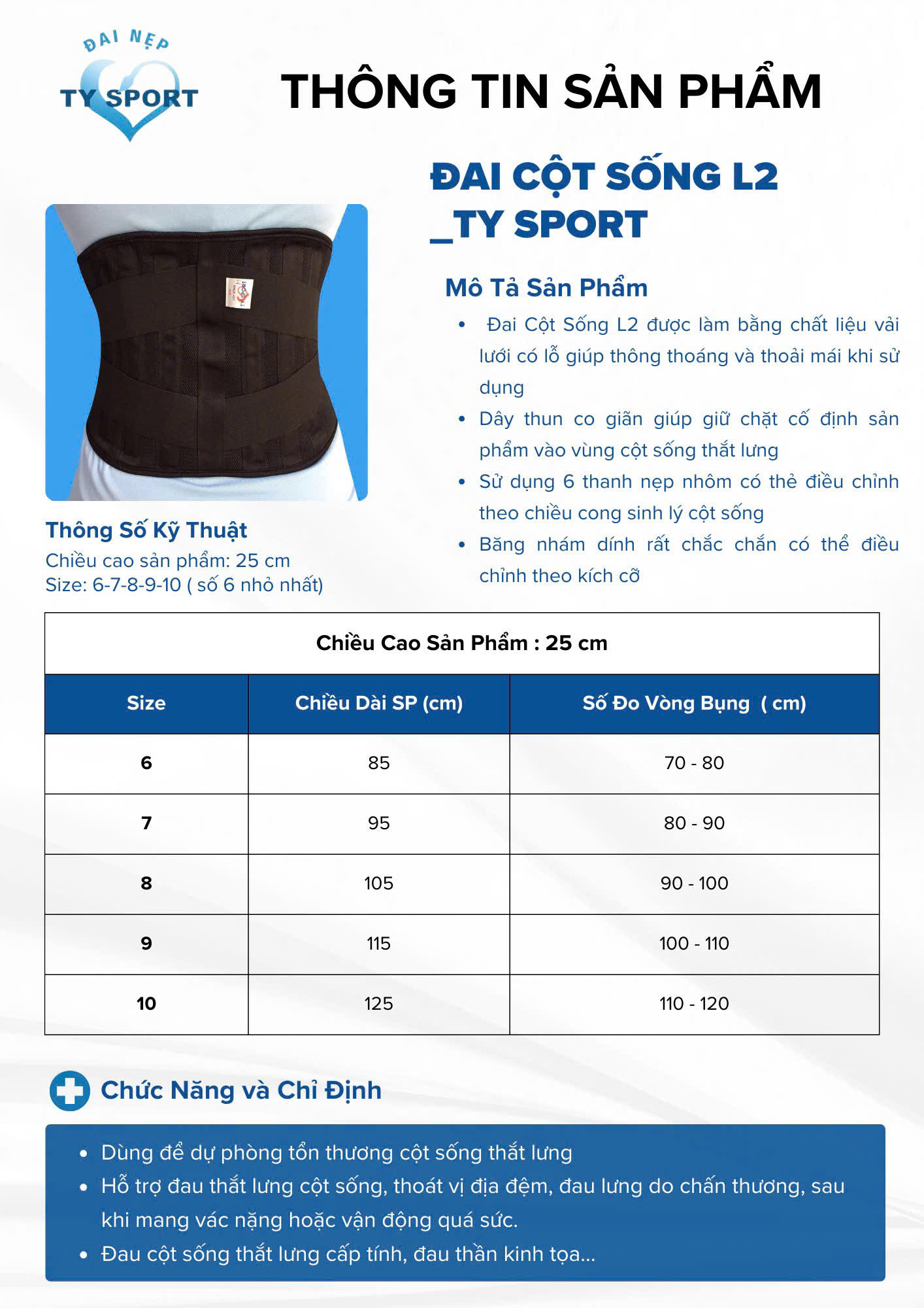 | Chức năng | Nâng đỡ – giảm đau – bảo vệ cột sống |
